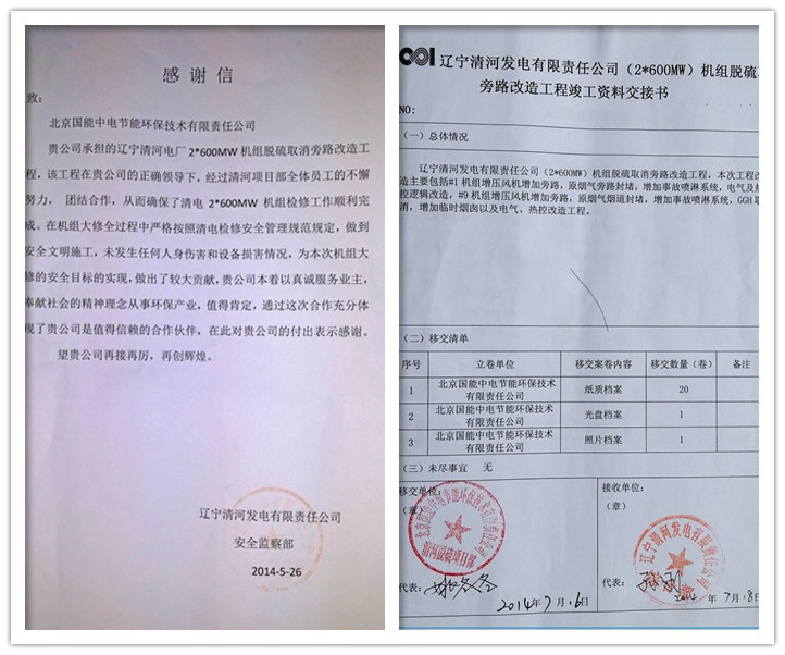 在公司總部的正確領導下,經過清河EPC旁路改造項目部全體成員的共同努力,7月18日,遼寧清河發電有限責任公司業主代表在竣工資料交接證書上簽字,標志著我公司承擔的遼寧清河電廠2*600MW機組脫硫取消旁路改造工程正式竣工驗收,成功打響了我司在中國電力投資集團的第一槍。