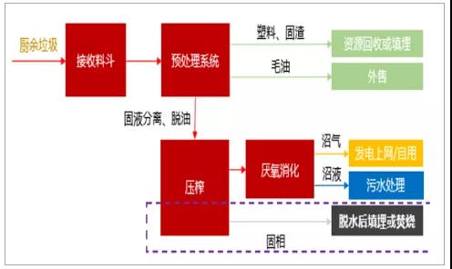 餐廚垃圾的特點包括有機物含量高,含水率高,易腐爛變質(zhì),易發(fā)酵、發(fā)臭,主要是采用厭氧消化、好氧堆肥和飼料化工藝等生物法進行處理。其中厭氧消化工藝能最大化回收油脂,無害化程度高,并能夠充分地對餐廚垃圾中的有機物進行資源化回收和利用,已經(jīng)有超過70%的餐廚垃圾處理項目使用這條技術(shù)路線,是現(xiàn)階段的主流工藝路線。