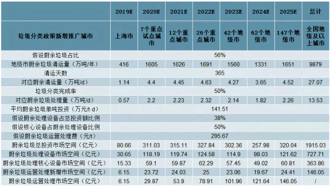 以100個餐廚垃圾試點城市的平均餐廚垃圾項目單噸投資額76.6萬元/t,處理費197元/t作為合理估計值,可得上海環(huán)境松江、上海環(huán)境嘉定、海峽環(huán)保福州、首創(chuàng)環(huán)保寧波(一期)4個項目的平均廚余垃圾單噸投資額為141.5(萬元/t)。考慮到廚余垃圾的綜合處理費較高,假設(shè)廚余垃圾處理費是餐廚垃圾的1.5倍為295.7(元//t•d),以地級及以上城市平均每天產(chǎn)生約27萬噸廚余垃圾測算,在中性情景下(即垃圾分類完成率為50%),廚余垃圾總投資額市場空間為1915億;按廚余垃圾處理設(shè)備占總投資額的38%,核心設(shè)備占廚余處理設(shè)備的50%計算,對應市場空間為364億;2025年廚余垃圾運營處理市場的空間預計可達146億元,市場空間廣闊。
